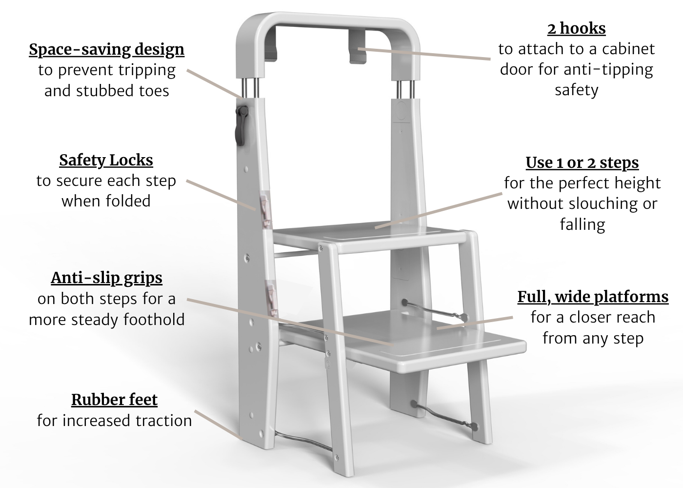 I designed the Next-Step Stool after one too many late nights searching for a safe, space-saving stool that actually worked for my kids. Every option was bulky, heavy, and awkward to move — so I decided to create my own. Five years, ten prototypes, and two startup competition wins later, we perfected a design that folds flat to just four inches, hooks securely onto any cabinet door, and grows with your child. Safe enough for my kids, sleek enough for your home — it’s the smarter, simpler way to give little ones a step up.